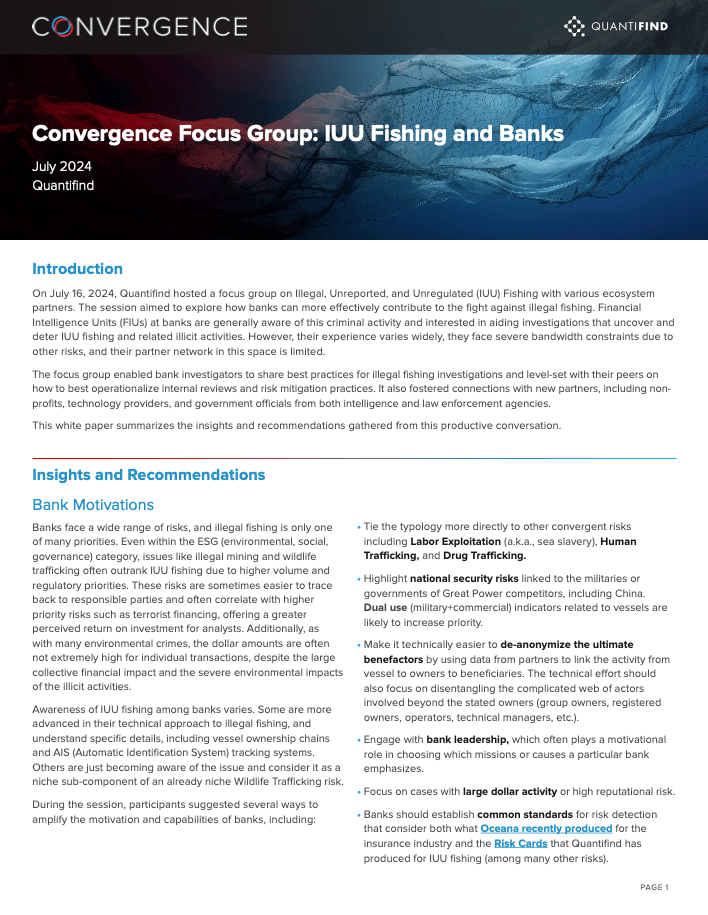 This white paper builds on the discussion and summarizes the recent IUU focus group discussion, addressing the challenge of disrupting the financial networks of illegal fishing perpetrators and presenting actionable recommendations derived from the collaborative dialogue.