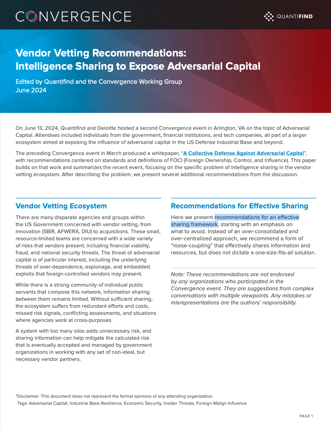 This white paper builds on the discussion and summarizes the recent Convergence for Adversarial Capital event, focusing on the specific problem of intelligence sharing in the vendor vetting ecosystem. After describing the problem, we present several additional recommendations from the discussion.
